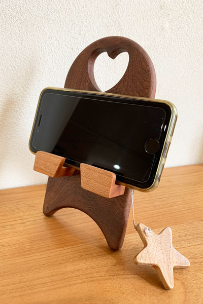 こちらの木製スマホスタンドは、縦でも横でも安定感バッチリ。