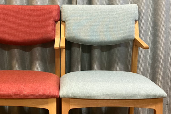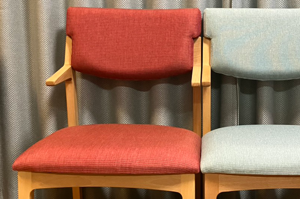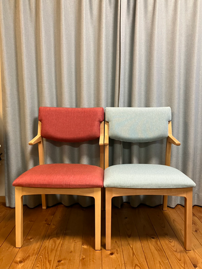 レッドとライトブルーのチェアは、背もたれと座面の張替えを行いました。