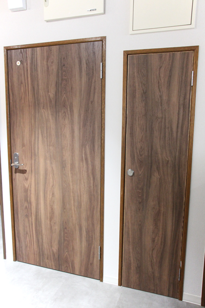 店内に元々ついていた扉にはパーテーションと同じ化粧板を貼りました。