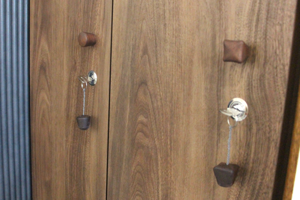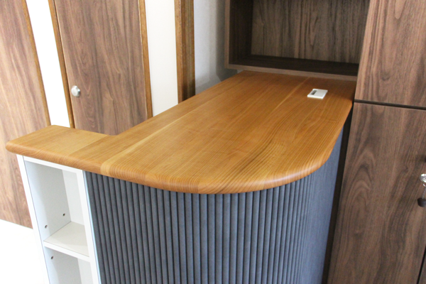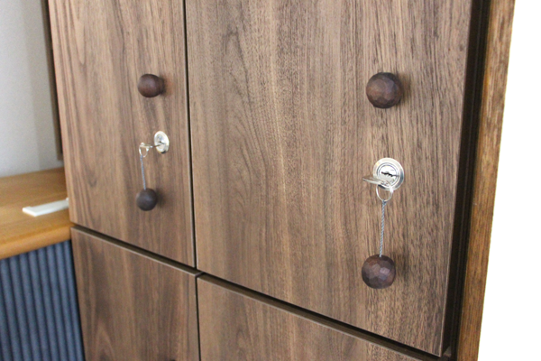 カウンターサイズ:W1300×D500×H1000樹 種 :天板/山桜材 側面/曲面化粧材塗 装 :ナチュラル色ロッカー 樹 種 :メラミン・ポリ化粧板 つまみ取手・ウォールナット材
