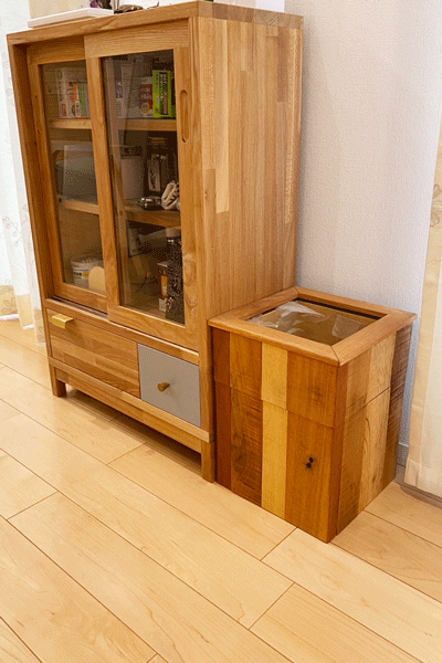 アップサイクルシリーズのダストBOXはご自宅のチェスト横に置いていただきました。