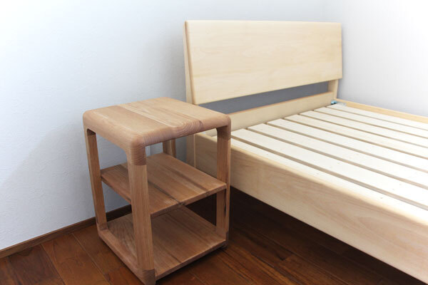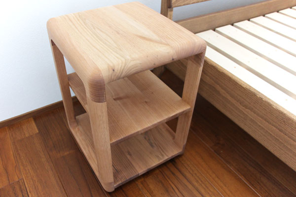 ベッドのお隣には「角の丸み」が特徴のWALNUSS(ヴァルヌス)サイドシェルフ。